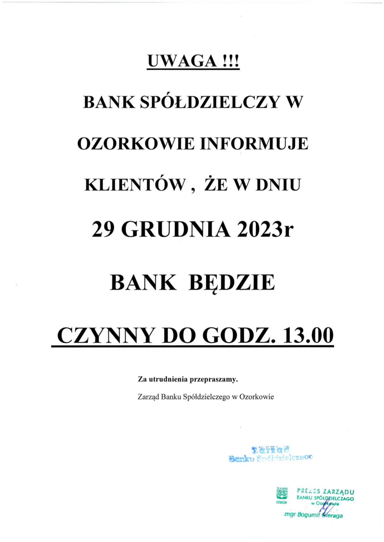 BANK SPÓŁDZIELCZY W OZORKOWIE INFORMUJE KLIENTÓW, ŻE W DNIU29 GRUDNIA 2023r BANK BĘDZIE CZYNNY DO GODZ. 13.00